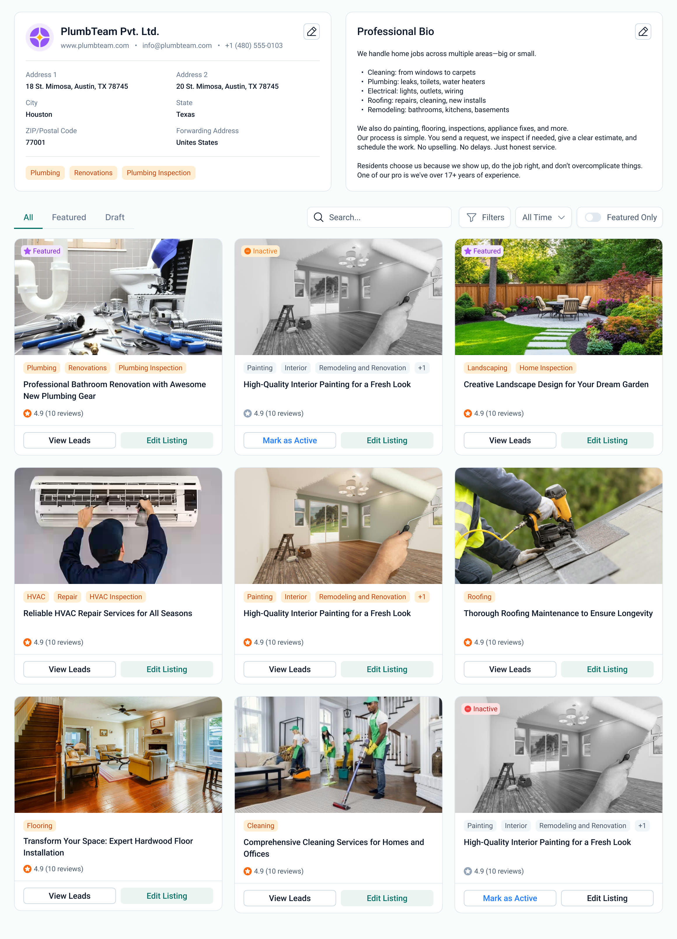 Every completed job builds your profile. Verified reviews from real homeowners, response time metrics, completion rates, and quality scores — all visible to property managers when they're choosing a vendor. Higher ratings mean more leads, more jobs, more revenue.