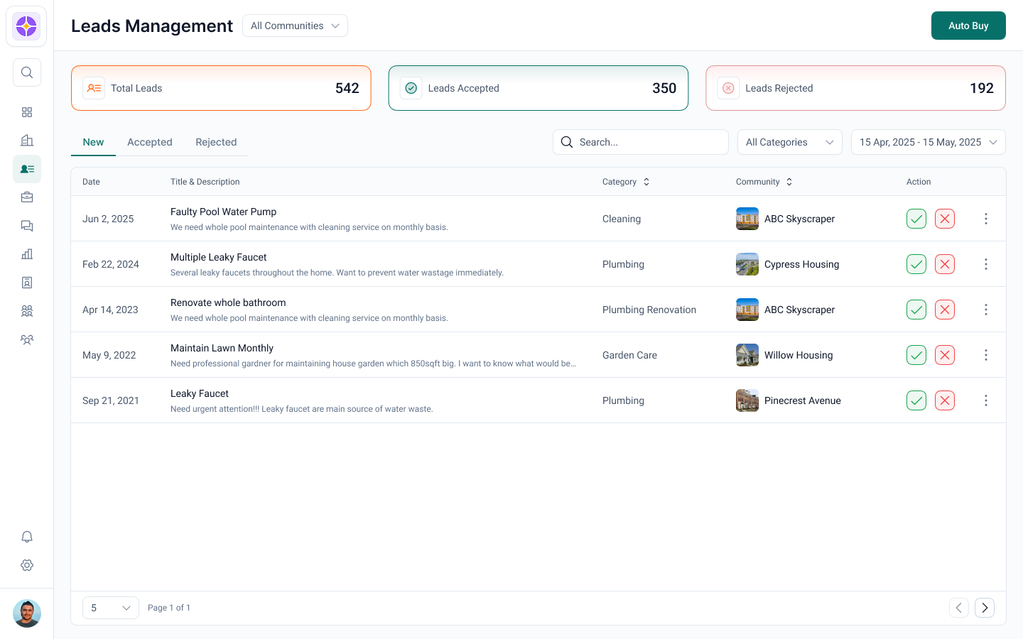 Homeowners submit service requests through their community app. Those requests become leads that land in your inbox — with full context, photos, and location. You see the price, the scope, and the community. Accept or decline in one tap. No cold calls, no truck rolls to tire kickers.